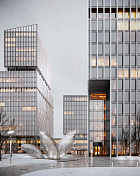 Архитектурной особенностью офисных башен станут динамичные, устремленные вверх объемы последних этажей. Вход в одно из офисных зданий подчеркнут выразительной высокой аркой, которая добавляет пластики фасаду и помогает связать объект с окружающим городским пространствам.