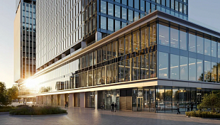 Архитектурной особенностью офисных башен станут динамичные, устремленные вверх объемы последних этажей. Вход в одно из офисных зданий подчеркнут выразительной высокой аркой, которая добавляет пластики фасаду и помогает связать объект с окружающим городским пространствам.
